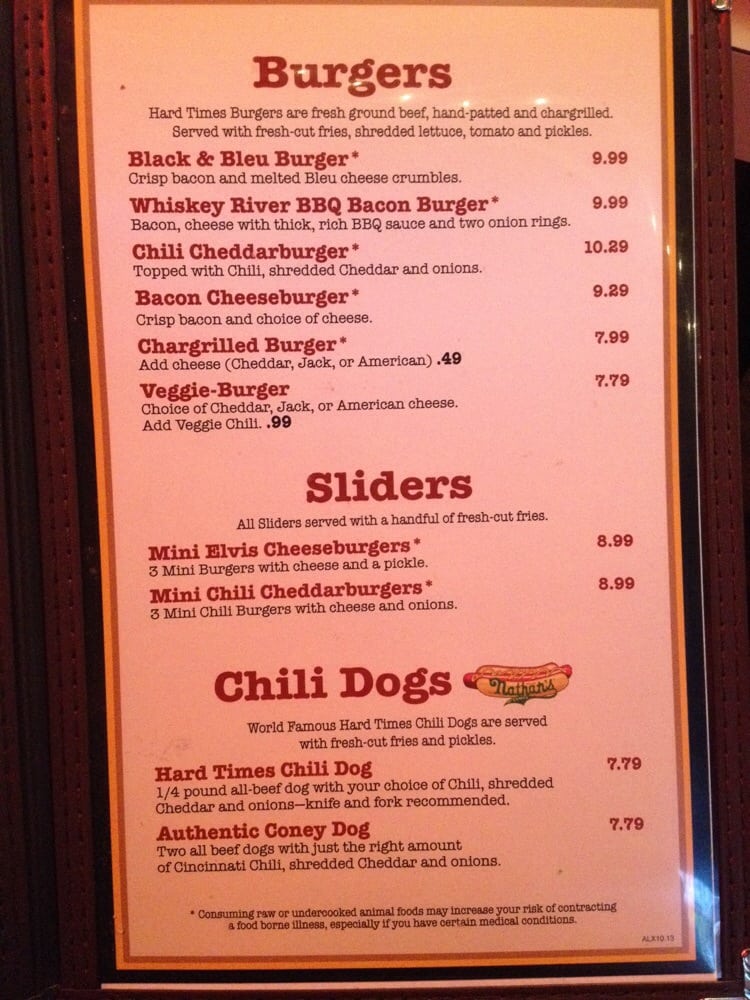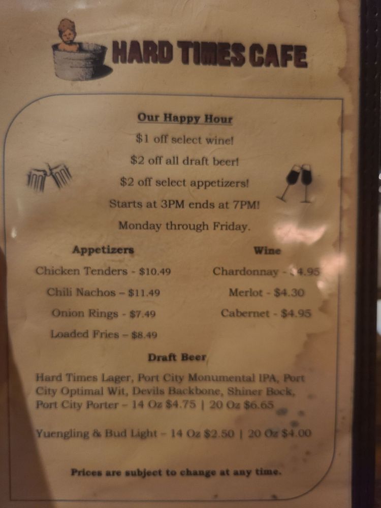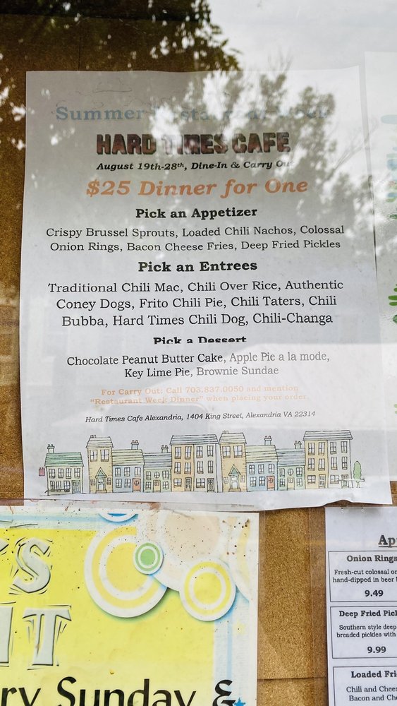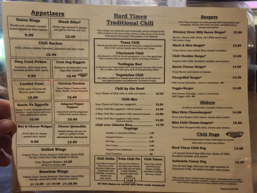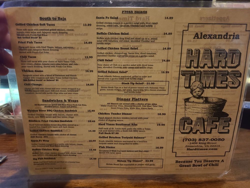 Introducing the menu at Hard Times Cafe, located in Alexandria, VA, is a treat for fans of hot dogs, American cuisine, and bar food. The diverse menu offers appetizers like Corn Dog Nuggets and Loaded Fries, fresh salads including the Santa Fe Grilled Chicken Salad and Buffalo Chicken Salad, and hearty burgers like the Black and Bleu Burger and Whiskey River BBQ Bacon Burger. Customers rave about the amazing chili options, especially the Chili Five Ways and Texas Chili, accompanied by delicious cornbread. The cozy and casual vibe, along with friendly service, make this a go-to spot for comfort food and cold beer. Whether you're looking for a quick bite or a leisurely meal, Hard Times Cafe has something for everyone.