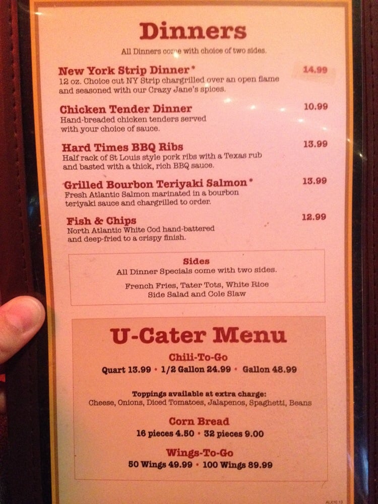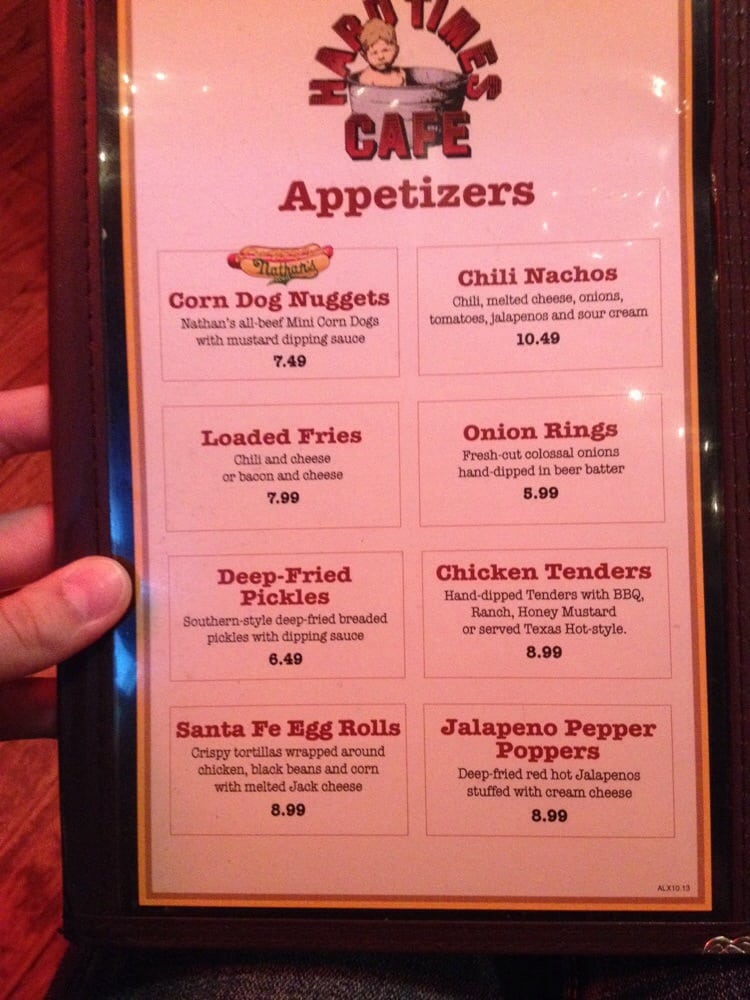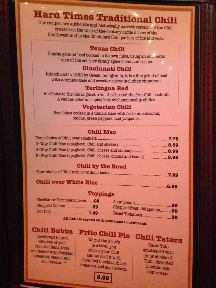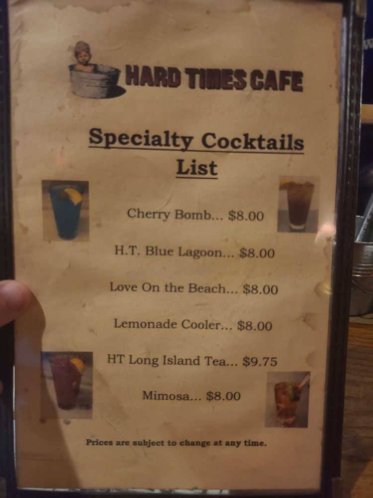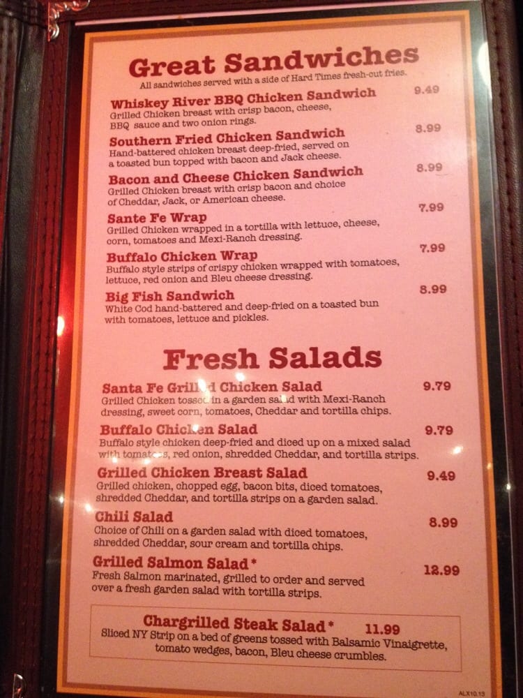 Introducing the menu at Hard Times Cafe, located in Alexandria, VA, is a treat for fans of hot dogs, American cuisine, and bar food. The diverse menu offers appetizers like Corn Dog Nuggets and Loaded Fries, fresh salads including the Santa Fe Grilled Chicken Salad and Buffalo Chicken Salad, and hearty burgers like the Black and Bleu Burger and Whiskey River BBQ Bacon Burger. Customers rave about the amazing chili options, especially the Chili Five Ways and Texas Chili, accompanied by delicious cornbread. The cozy and casual vibe, along with friendly service, make this a go-to spot for comfort food and cold beer. Whether you're looking for a quick bite or a leisurely meal, Hard Times Cafe has something for everyone.